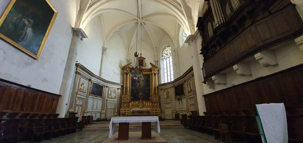 El altar mayor de madera dorada del siglo XVII, la decoración esculpida de la nave y la caja del órgano de principios del siglo XVIII completan un armonioso conjunto.