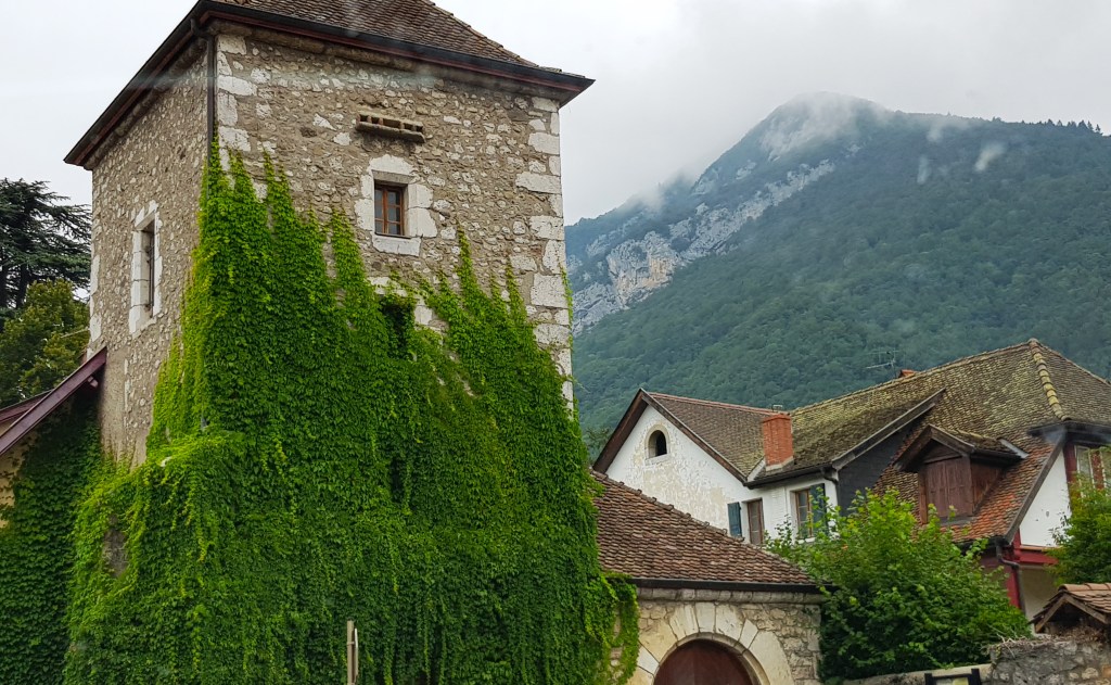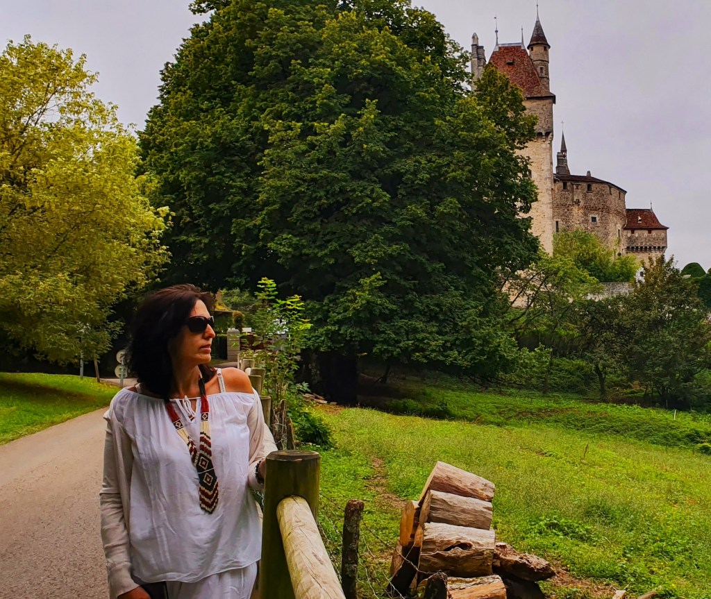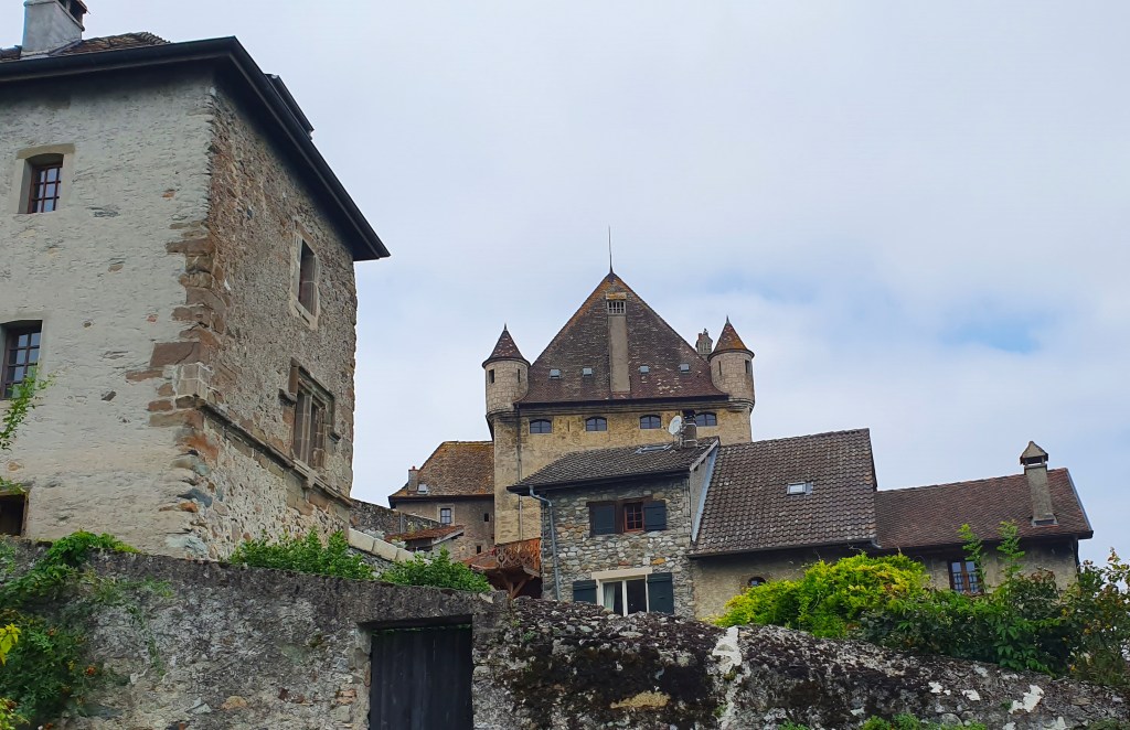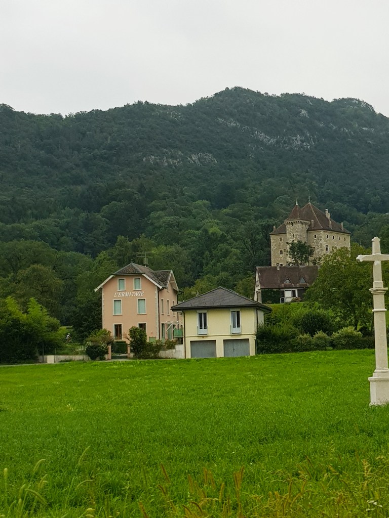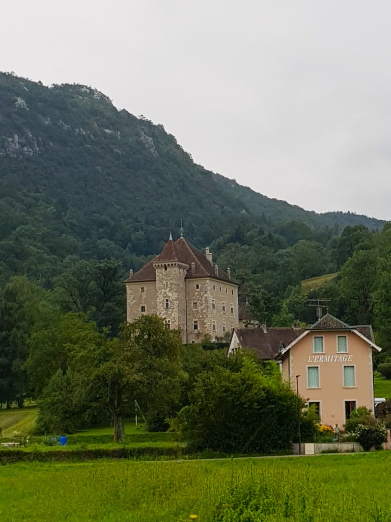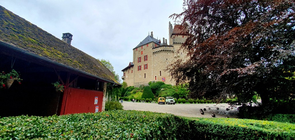 Después de un estupendo desayuno desayuno en les Prallets comenzamos nuestro cuarto día de ruta desde la población de Sainte Eustache, ubicada a solo 15 kilómetros de Annecy. Lo hicimos divisando y bordeando el lago Annecy en su vertiente sur, disfrutando de la exuberante naturaleza que le rodea. En la zona encontraréis varios castillos como pueden ser el Castillo Duingt, además de varios edificios interesantes de hoteles, etc. Como casi siempre nos esperaba otro intenso día viajero con bastantes kilómetros a cuestas y varias interesantes poblaciones en las que íbamos a detenernos. Tuvimos que escoger y decidimos acercarnos hasta la entrada del Castillo Menthon Saint Bernard.