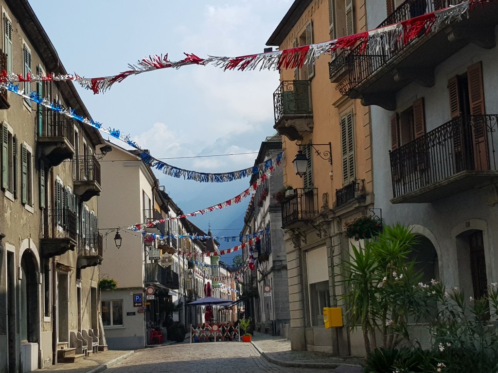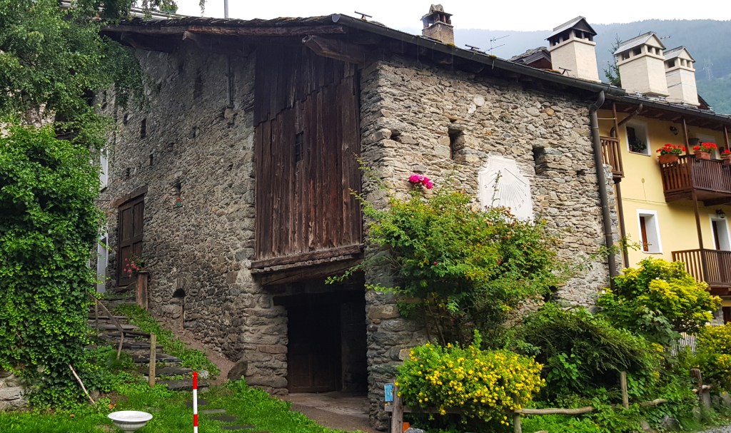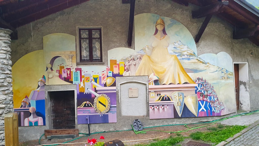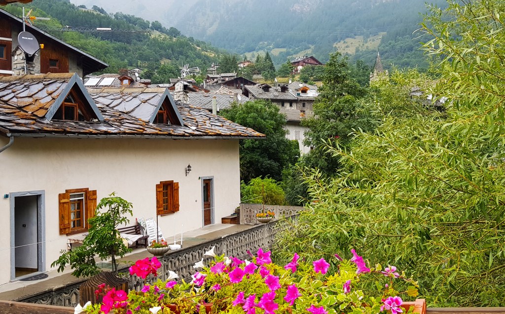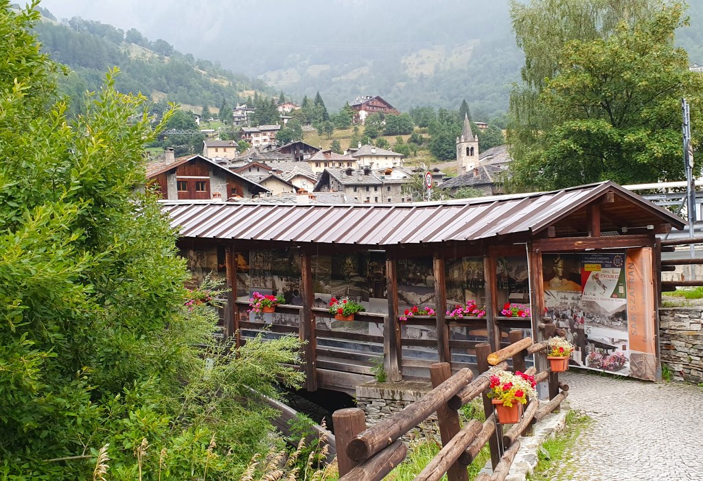 Una vez en Italia el primer pueblo que nos recibe es Etroubles, todavía con fonética y costumbres francesas. Los hoteles y casas de alojamiento siguen llamándose Maisones y el idioma francés aparece en primer lugar en los carteles turísticos del pueblo.