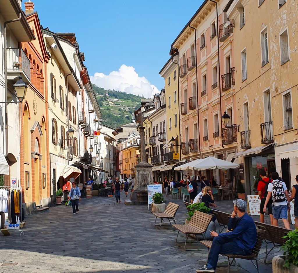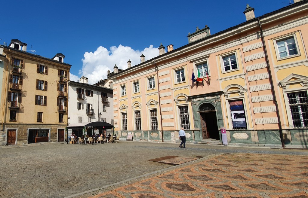 Continuamos nuestro recorrido por animadas calles hasta llegar a la Piazza de Emile Chanoux. En esta plaza se ubicó el monasterio de San Francesco en el siglo XIV y que fue derribado para construir el actual edificio del ayuntamiento, construido en el año 1841.
