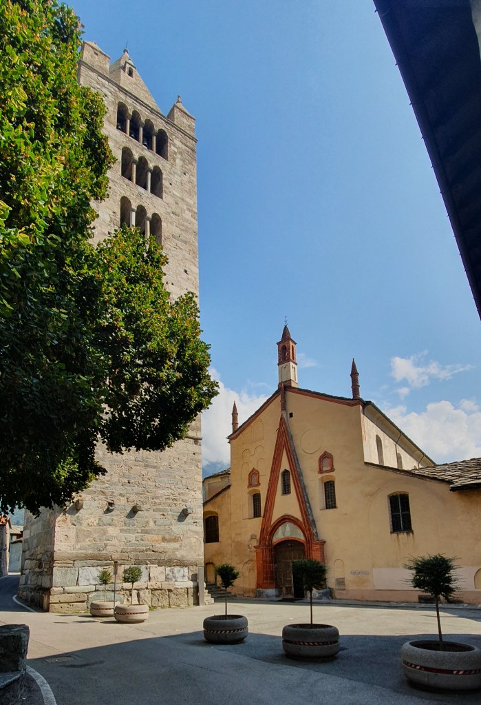 La catedral católica romana de Aosta fue construida en el siglo IV aunque su fachada neoclásica actual fue construida en los años 1846-1848. De la época románica quedan dos torres de reloj y una cripta, así como parte de un fresco otoniano en el techo de la iglesia.