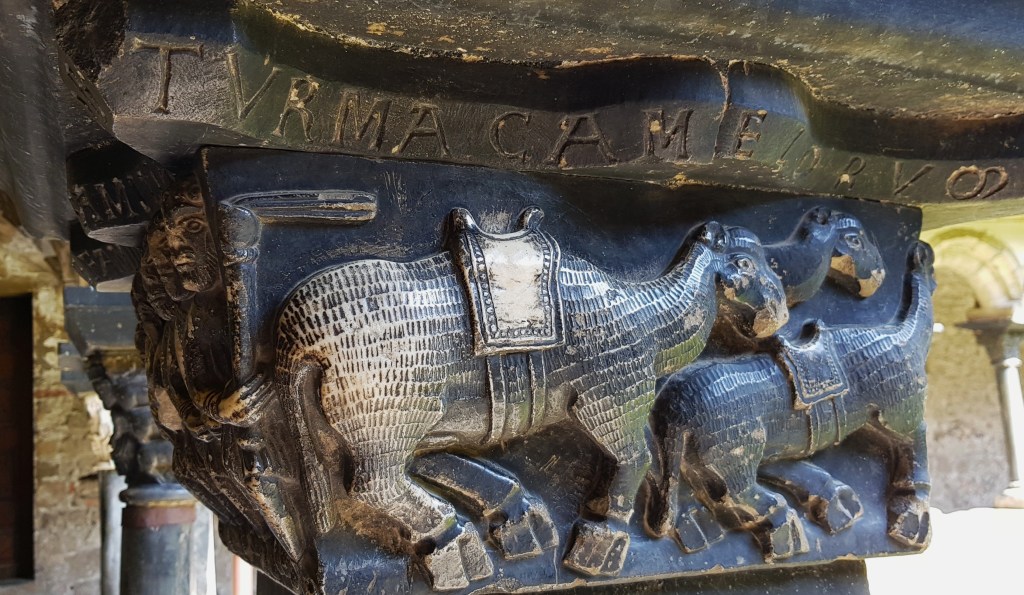 Espectaculares sus capiteles, esculpidos en mármol pero revestidos con pintura oscura. Representan escenas simbólicas del Nuevo y del Antiguo Testamento, de la vida de San Orso, personajes y animales fantásticos, y otros elementos decorativos. Se consideran una de las mayores expresiones de la escultura románica religiosa italiana.