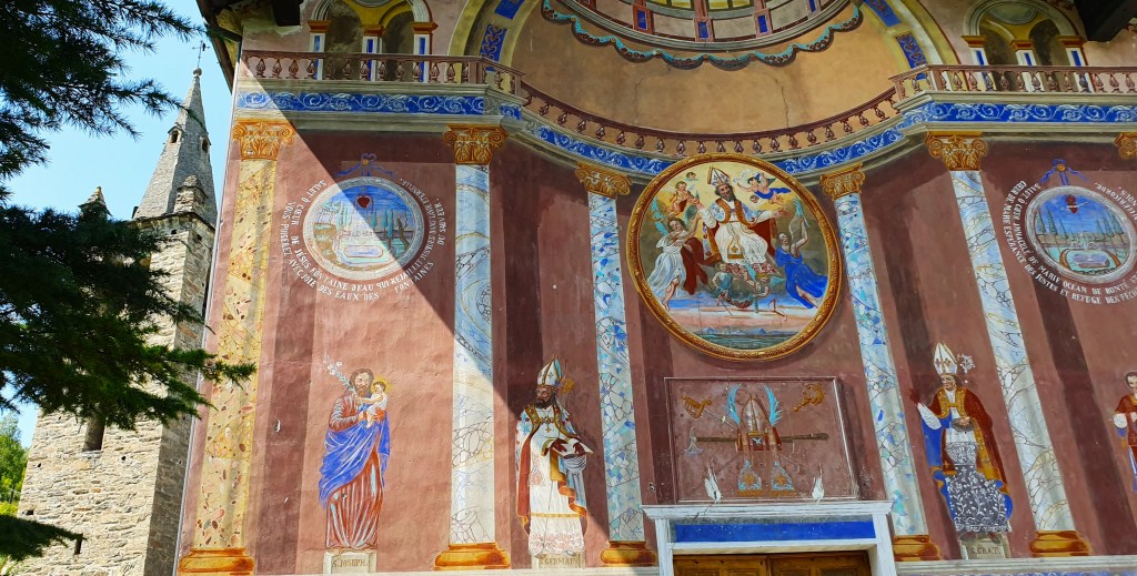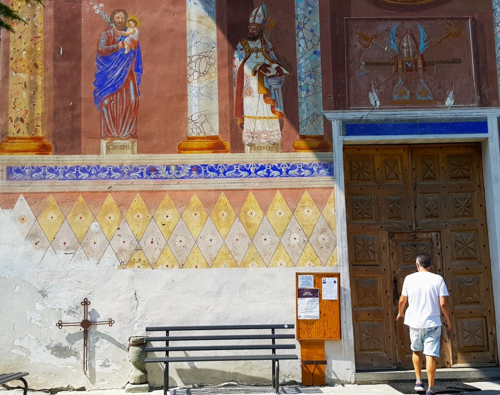 En el pueblo no debéis dejar de visitar la Iglesia de Saint Léger, en la que llama mucho la atención su fachada trompe-l’oeil (pintura sobre fachadas). Su aspecto actual data del año 1762, pero conservando del edificio anterior el campanario siglo XIV. No pudimos visitar su interior, en el que hay una pequeña cripta del siglo X.