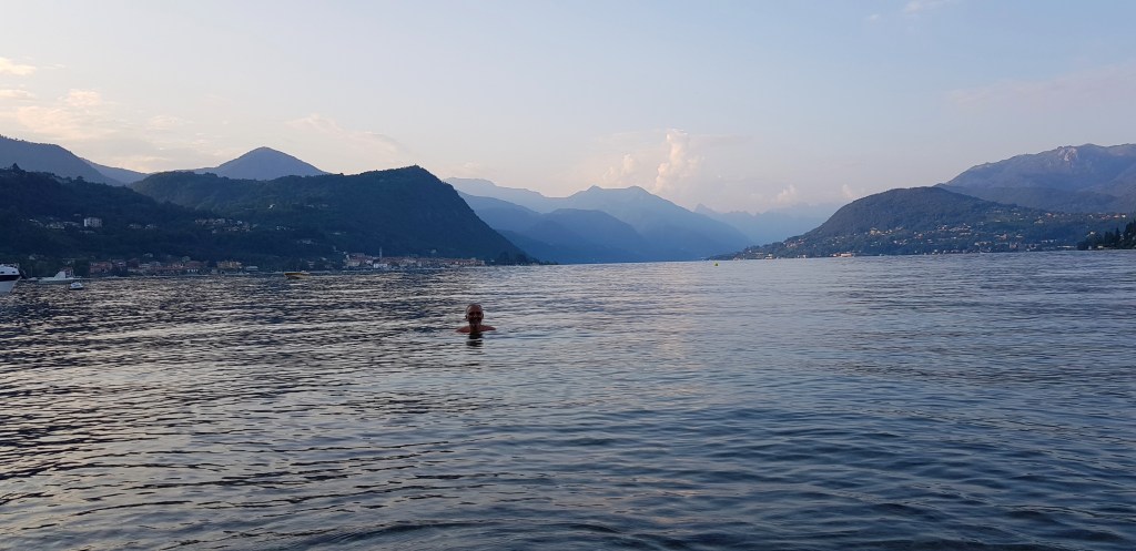 Después de acomodarnos en Guesthouse San Giulio, nos pegamos un relajante baño en las cálidas aguas del lago, en las que lo corriente sería pensar lo contrario por proximidad de los Alpes. El lago es uno de los más pequeños y menos conocidos del noroeste italiano, como por ejemplo su vecino Lago Maggiore.