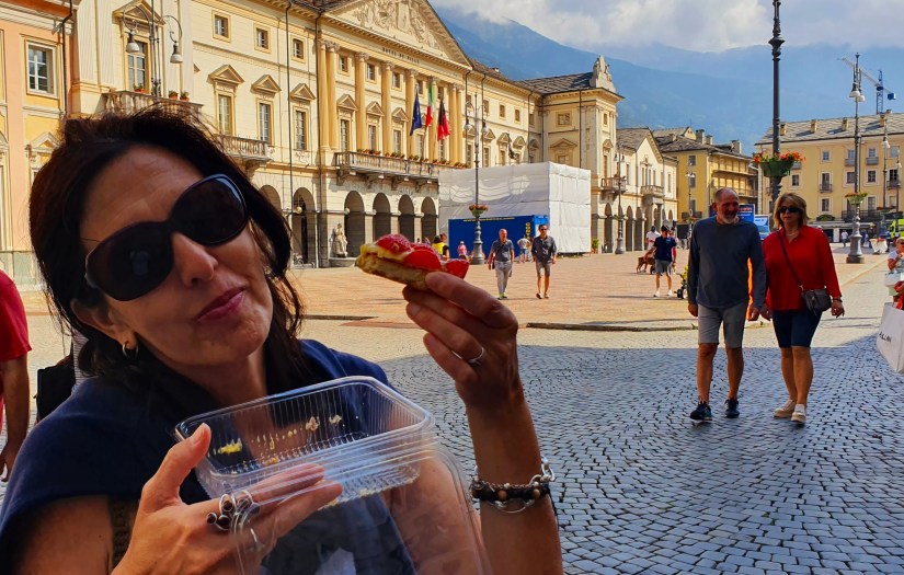 El día comenzó de forma inesperada con la visita inicial de la ciudad de Aosta, porque previamente teníamos planificado visitar algunos de los castillos del Valle. Pero el día anterior detectamos un ruido en las pastillas de freno del vehículo, que nos obligó a dedicar en la mañana de este sábado 24 agosto para la reparación y sustitución de este elemento fundamental del vehículo.