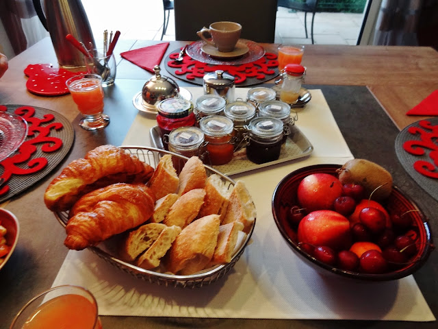 El desayuno impresionante, compuesto por zumo natural, café, te, croasaints, brioches, tartas, quesos locales, brochetas de frutas, pan , mermeladas, etc … un lujazo para todos los sentidos!!!