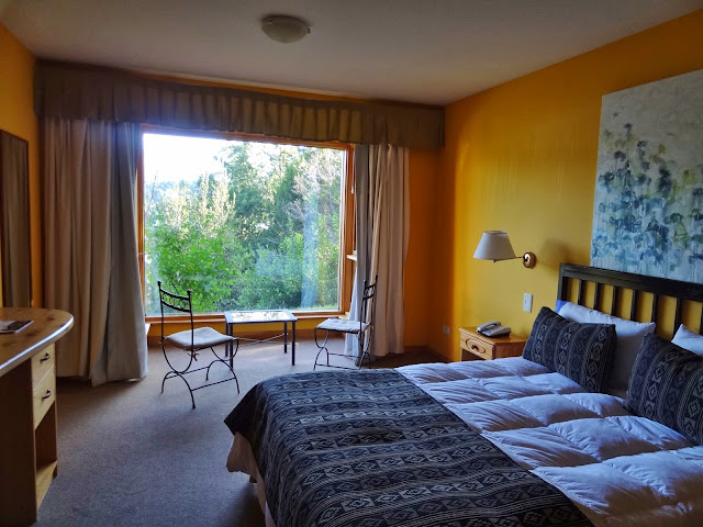 Nos alojamos en una de las preciosas cabañas de madera con grandes ventanales y perfectamente equipadas ,del Hotel El Mirador del Guadal que tiene unas esplendidas vistas al Lago Carrera., hotel muy familiar pero de exquisita atención.