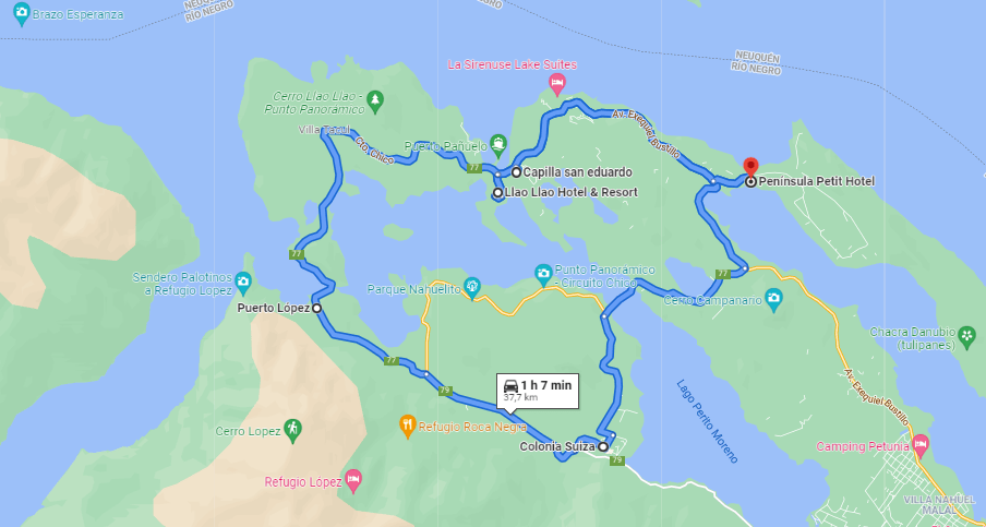 Este hotel se encuentra aproximadamente a 21 kilómetros del centro San Carlos de Bariloche , y el camino esta poblado de cabañas de madera, viviendas magníficas, hoteles, etc.